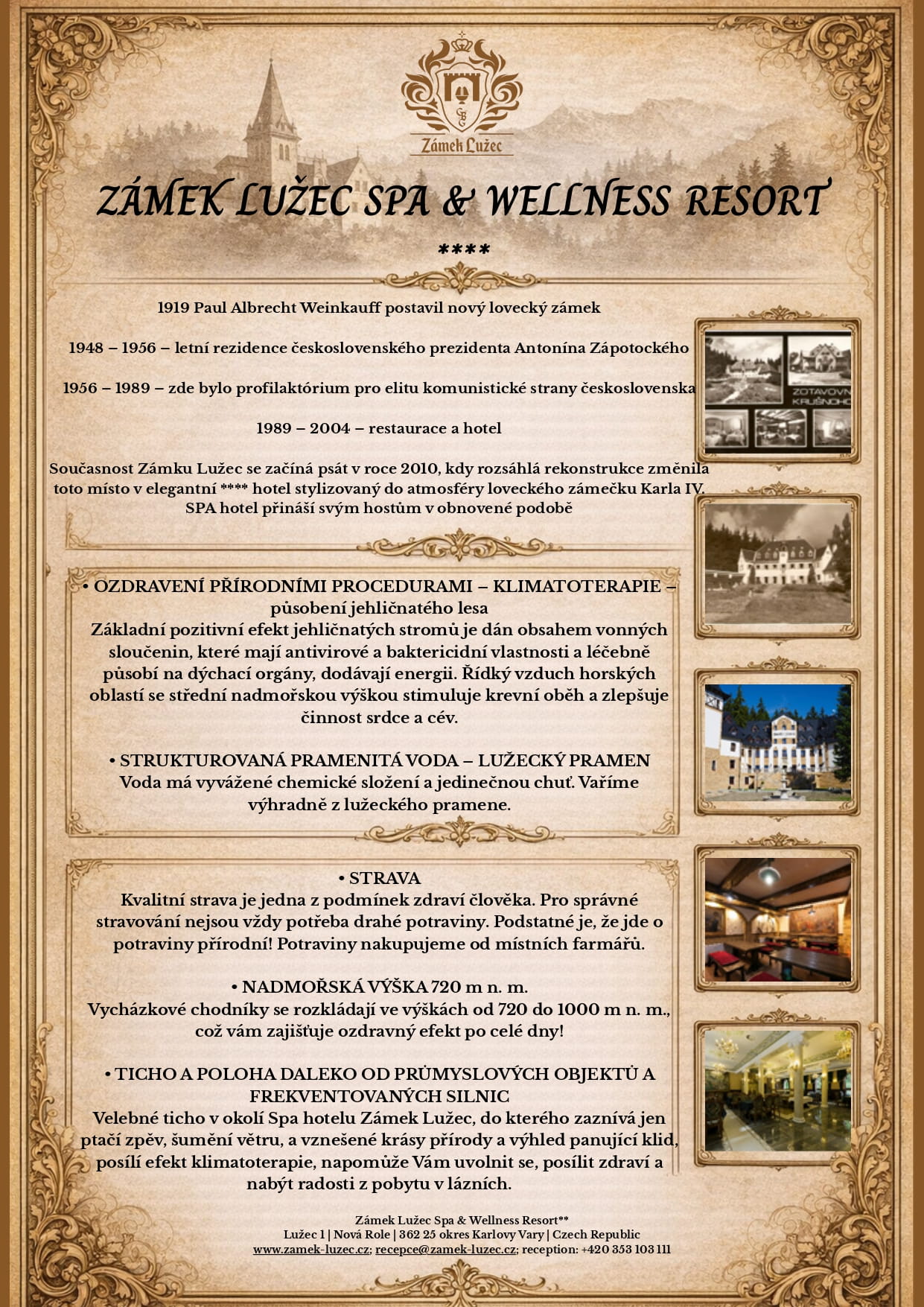 Historie lázní Karlovy Vary a Zámku Lužec jsou navzájem úzce provázané, a pamatují doby úpadku i rozmachu. Tato místa se nejvíce dostávala do povědomí v dobách živelných pohrom a nejrůznějších válek. Nejbouřlivější rozkvět zažily Karlovy Vary, když se zde v ohromném množství stavěla sanatoria a ozdravovny. Období po první světové válce je epochou rozkvětu Zámku Lužec, kdy v roce 1919 místní movitý mecenáš Paul Albrecht Weinkauf, uchvácený starými pověstmi a okolní přírodou pověřil známého mnichovského architekta Brendla, aby přestavěl staré lovecké nocležiště na nový zámek. Později, po smrti tohoto magnáta, je zámek převeden do majetku zdravotní pojišťovací společnosti, která v tomto městě založila sanatorium.